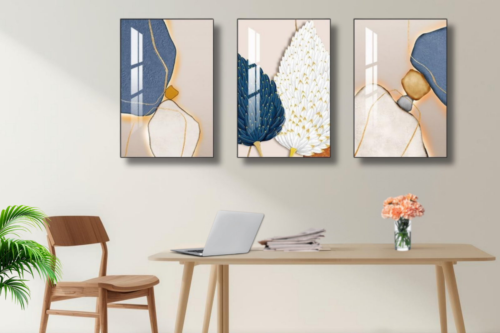 This elegant set of 3 abstract canvas wall art pieces features a refined blend of soft beige, deep blue, and subtle gold accents, creating a modern minimalist aesthetic with a natural, calming feel. The organic shapes and delicate line details add visual interest without overwhelming the space, making this artwork ideal for contemporary, boho, or modern interiors. Perfect for elevating living rooms, bedrooms, kitchens, or office spaces, this large wall art set brings balance, warmth, and understated sophistication to any décor.