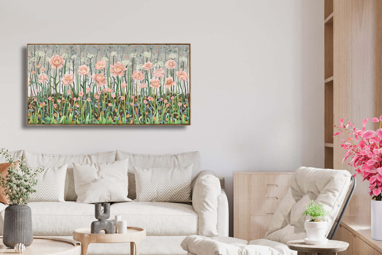 This oversized botanical canvas is a soft, elegant statement piece that blends delicate pale pink blooms with layered green stems and subtle woodland textures. The abstract wildflower design feels modern yet timeless — refined without being overly formal.