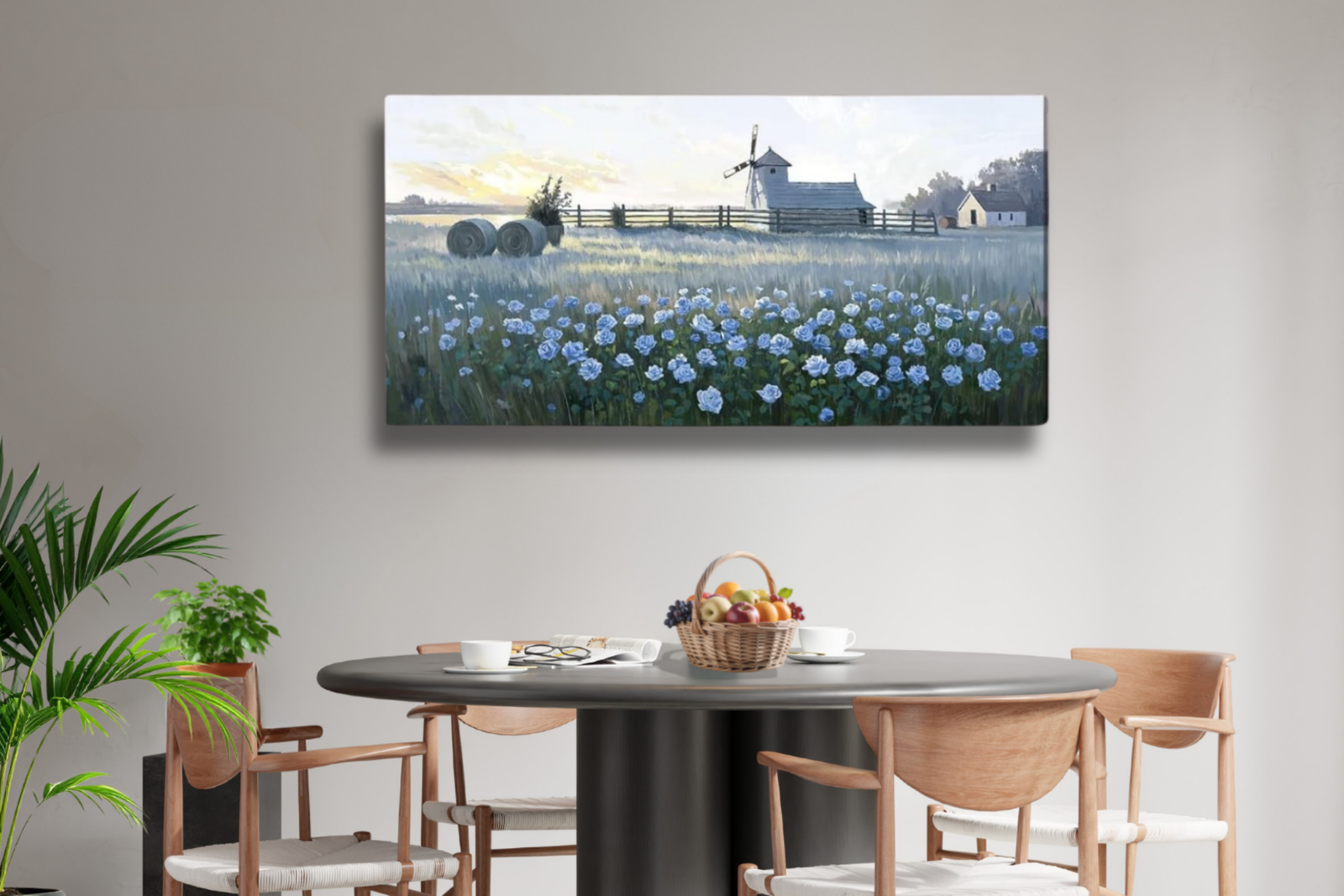 If you love calm countryside charm, this oversized farmhouse canvas brings serenity straight into your space. Featuring soft blue roses in the foreground and a peaceful windmill landscape in the distance, the artwork captures that quiet early-morning glow across open fields.