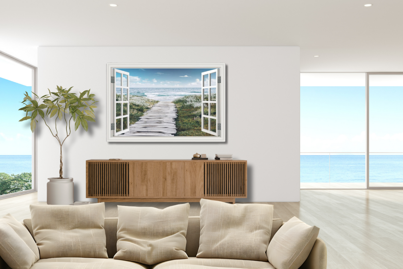 The gentle blue tones, airy sky, and natural coastal elements instantly brighten any space, making this wall art ideal for living rooms, bedrooms, bathrooms, offices, or beach-inspired interiors. The faux window design adds depth and openness, perfect for smaller rooms or areas that need a calming visual escape.