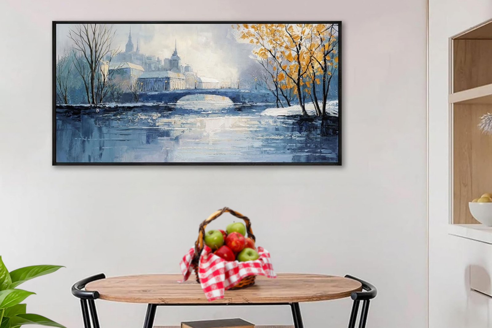 The painterly brushstrokes and misty background give the piece an elegant, contemporary feel, making it ideal for modern living rooms, bedrooms, or professional office spaces. Its elongated horizontal format works especially well above dining tables, sofas, or console units, where it adds visual balance and a sense of openness.