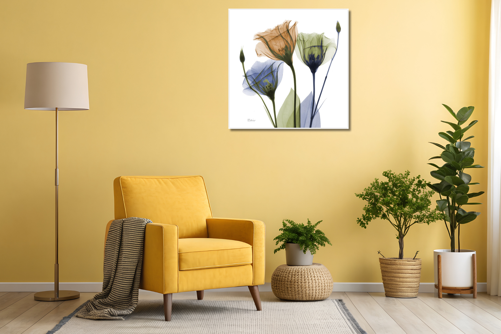 Gentian Buddies by Empire Art Direct features delicately layered, X-ray–style florals in soothing blue, green, and warm amber tones. The translucent petals and slender stems create an ethereal, almost watercolor effect that feels light, refined, and contemporary.