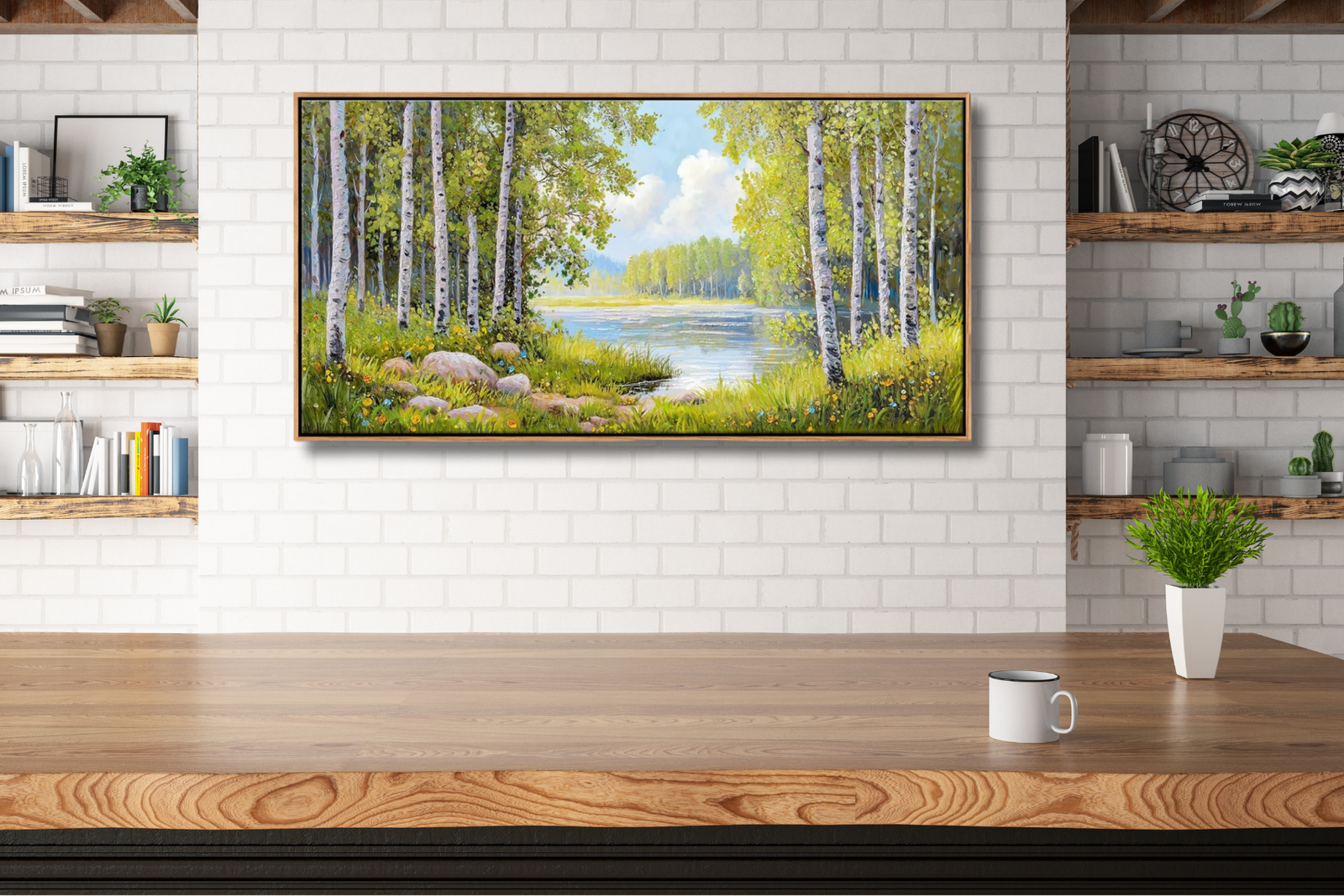 This forest and mountain wall art showcases a tranquil natural scene with slender trees, soft greenery, and a peaceful lake stretching into the distance. The fresh green tones and gentle brush textures bring a sense of calm and openness, making it an inviting addition to any room. Framed for a clean, finished look and sized at 20″ x 40″, this landscape artwork works beautifully in living rooms, bedrooms, offices, or quiet reading spaces. Ideal for nature-inspired, minimalist, or modern interiors, it creates a soothing connection to the outdoors.
