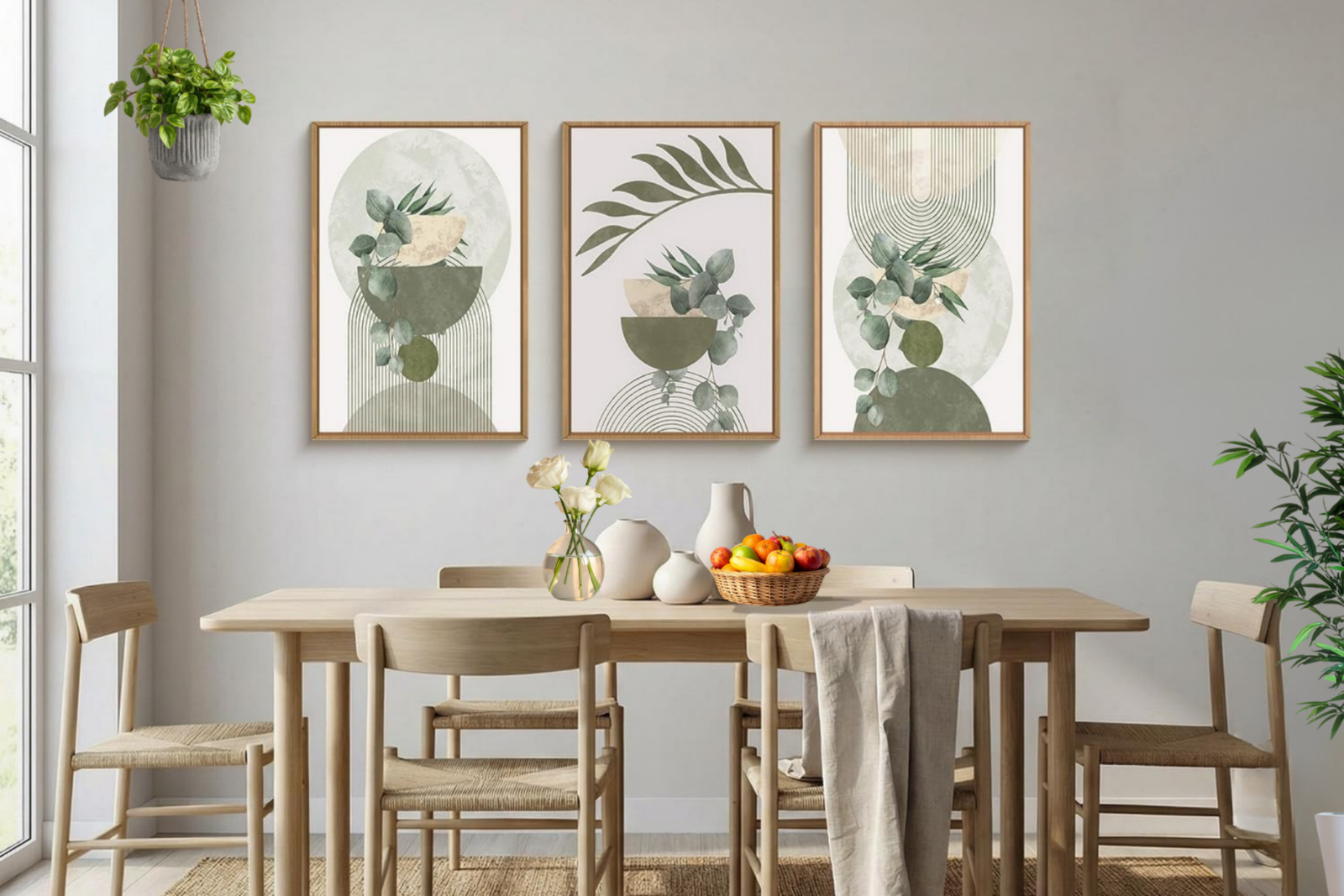 The muted sage greens, warm beige tones, and gentle curved lines make this set ideal for minimalist, Scandinavian, Japandi, or modern boho interiors. Each piece features layered geometric arches and delicate botanical leaves, framed in warm wood for a clean, polished finish.