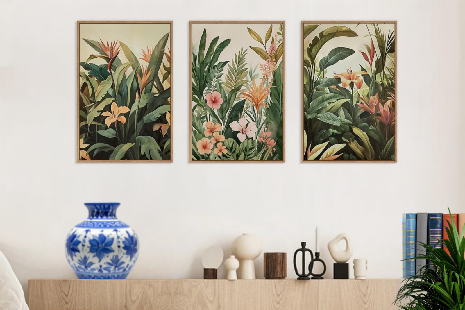 Bring a calm, nature-inspired feel into your space with this modern boho tropical wall art set. Featuring lush green banana leaves and soft floral accents, these botanical canvas prints add warmth and freshness without overwhelming the room. The balanced earthy tones and contemporary style make them perfect for living rooms, bedrooms, offices, or any space that needs a touch of relaxed jungle charm. Beautiful on their own or as a cohesive gallery set, they pair effortlessly with modern, boho, or minimalist interiors.