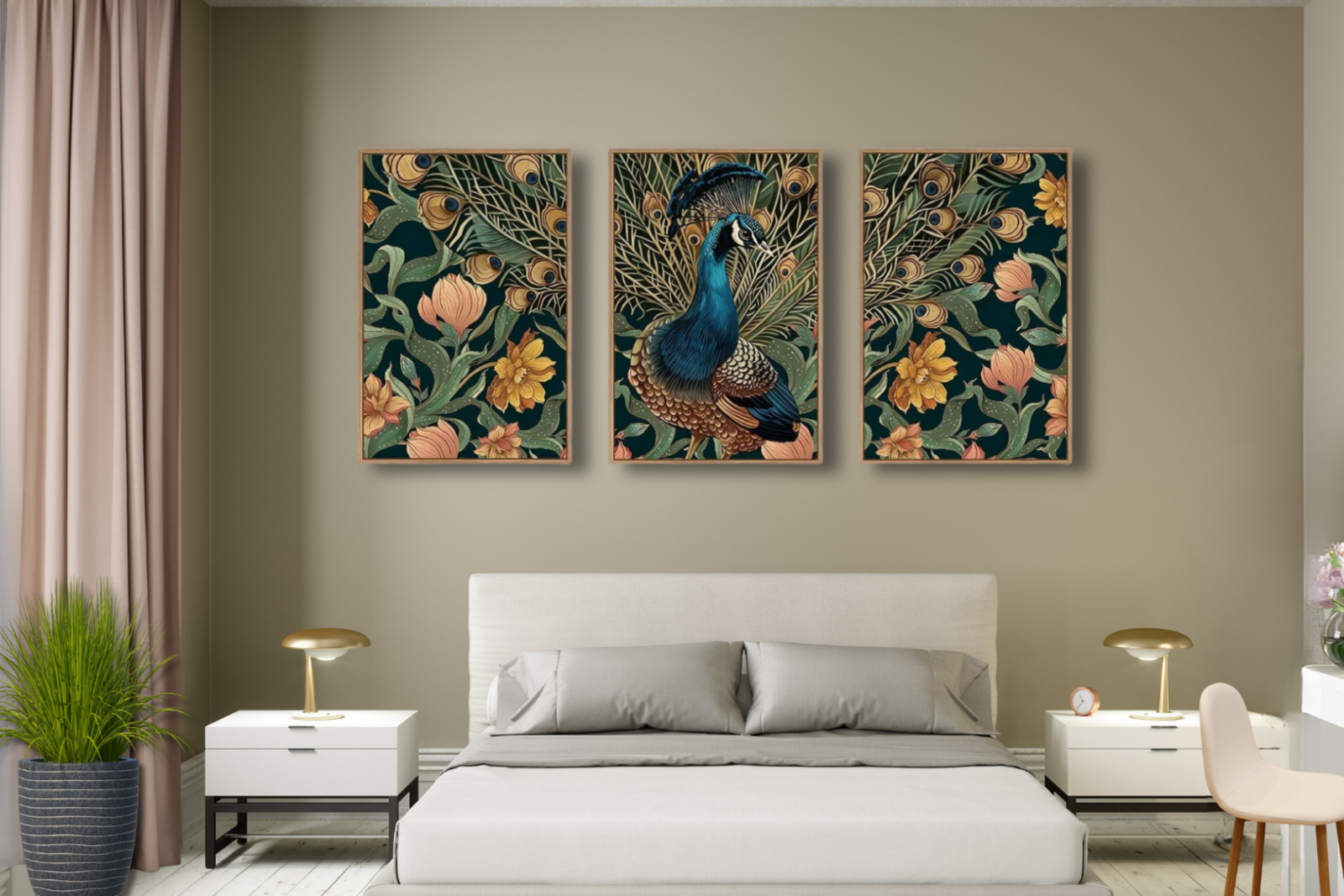 Beautifully balanced across three framed panels, this peacock wall art brings a sense of grace, beauty, and artistic detail to any space. Ideal for living rooms, offices, or bedrooms, the classic peacock and floral design complements modern, boho, eclectic, and traditional interiors alike. Ready to hang, this framed canvas set instantly elevates your wall with elegance and character.