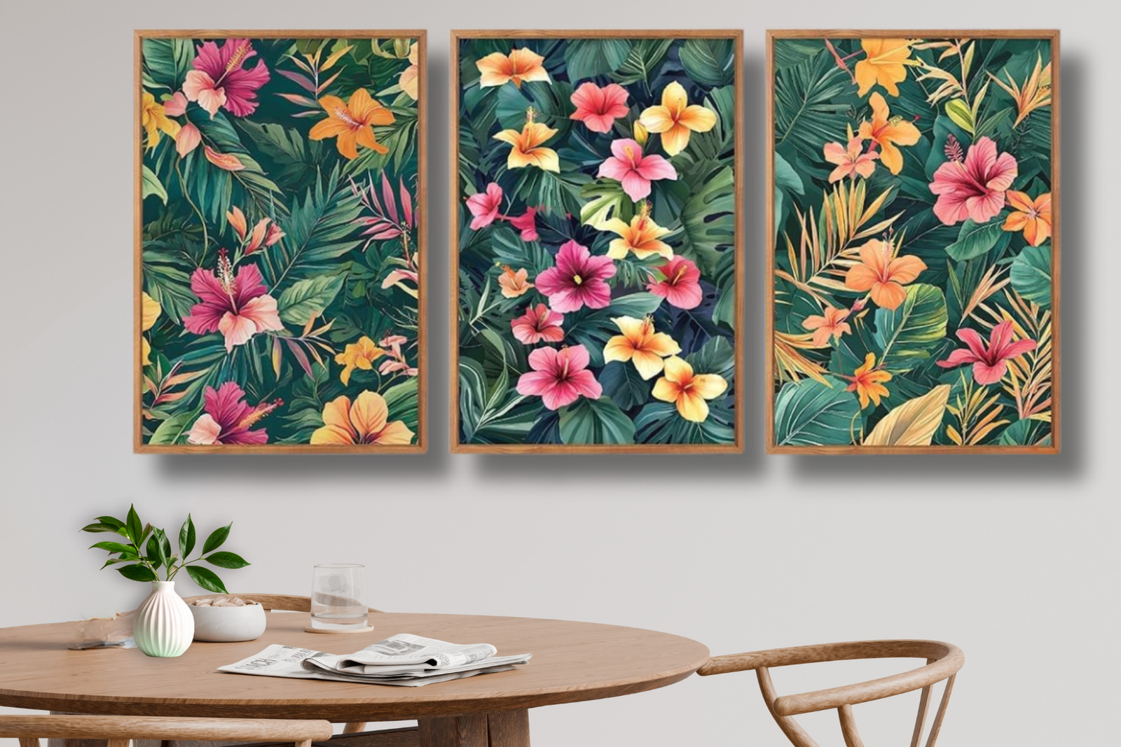 Each panel showcases a harmonious balance of pink, coral, and golden hibiscus blooms layered against deep green tropical leaves, offering both visual depth and a calming, nature-inspired feel. The warm wooden frames add a refined finish, making this set perfect for homeowners who love modern botanical decor with a timeless twist.