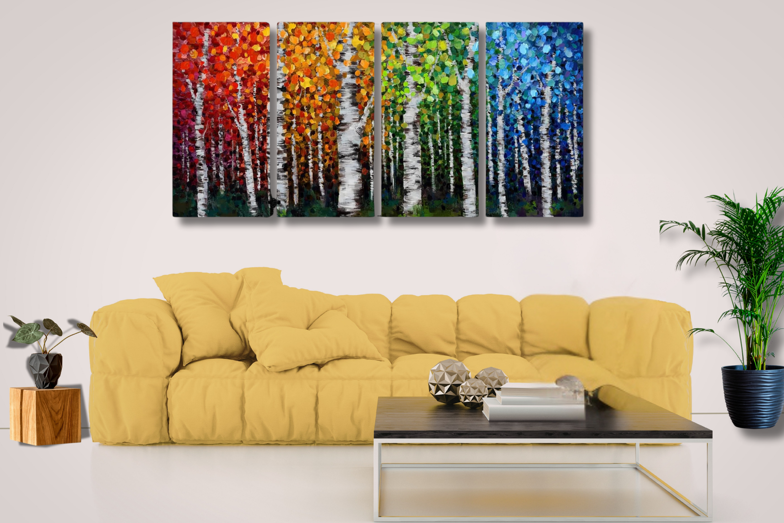 Bring the beauty of nature indoors with this stunning 4-panel birch tree wall art set, designed to represent the changing colors of the four seasons. Each canvas showcases elegant white birch trunks set against richly textured foliage, transitioning from warm reds and oranges to fresh greens and calming blues.