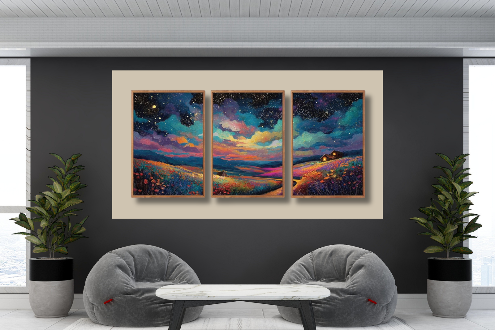Transform your space with the dreamy elegance of the KAIRNE Framed Abstract Midnight Canvas Wall Art Set. This striking three-panel artwork captures a magical night landscape filled with glowing stars, rolling hills, and vibrant wildflowers, all painted in rich, expressive colors.