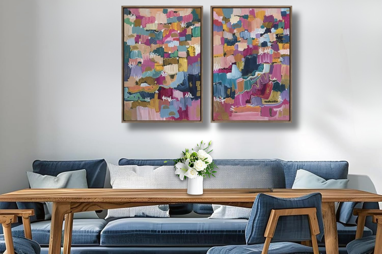 Bring a refined burst of color and modern artistry into your space with the Kate and Laurel Sylvie Applause Framed Canvas Wall Art Set by artist Leah Nadeau. This coordinated set of two abstract canvases features expressive brushstrokes and layered hues that create movement, depth, and visual interest without overwhelming the room.