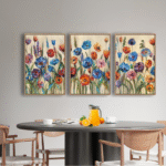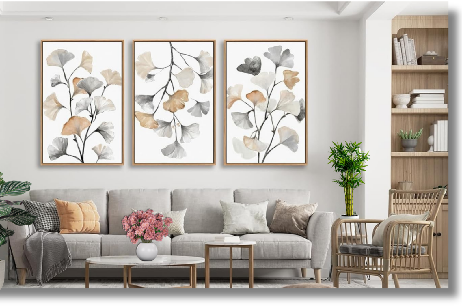 This elegant three-panel botanical wall art brings a soft, calming presence to any living space. Featuring delicate ginkgo-style leaves in neutral tones of beige, grey, and warm taupe, the artwork blends modern minimalism with boho charm. The airy composition and subtle watercolor textures make it ideal for living rooms, bedrooms, dining areas, or offices, adding warmth without overwhelming the space. Beautifully framed, it creates a refined gallery look that complements Scandinavian, modern, and contemporary interiors.