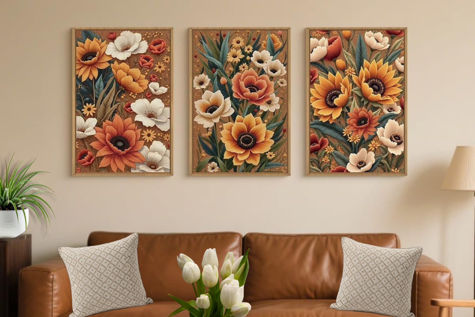 This large boho botanical framed canvas wall art features richly detailed floral motifs inspired by embroidery and wildflower patterns. With warm earthy tones, layered textures, and an abstract botanical style, it brings a cozy yet artistic feel to any space. Perfect for living rooms, bedrooms, dining areas, or offices, this floral artwork adds depth, warmth, and a touch of handcrafted elegance to modern, boho, or eclectic interiors.