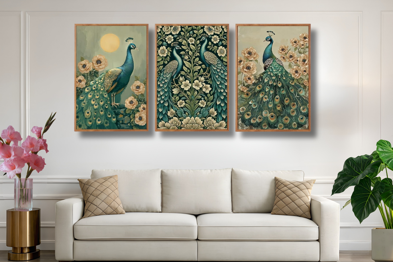 The LHIUEM Graceful Peacock Framed Wall Decor features a stunning trio of peacocks rendered in rich blue-green tones with a vintage, ornamental feel. The symmetrical composition and flowing tail feathers create a sense of harmony and quiet elegance, making this canvas set a refined focal point for any room. Framed and ready to hang, these peafowl prints bring a touch of timeless artistry and nature-inspired sophistication to bedrooms, living rooms, or serene sitting areas.