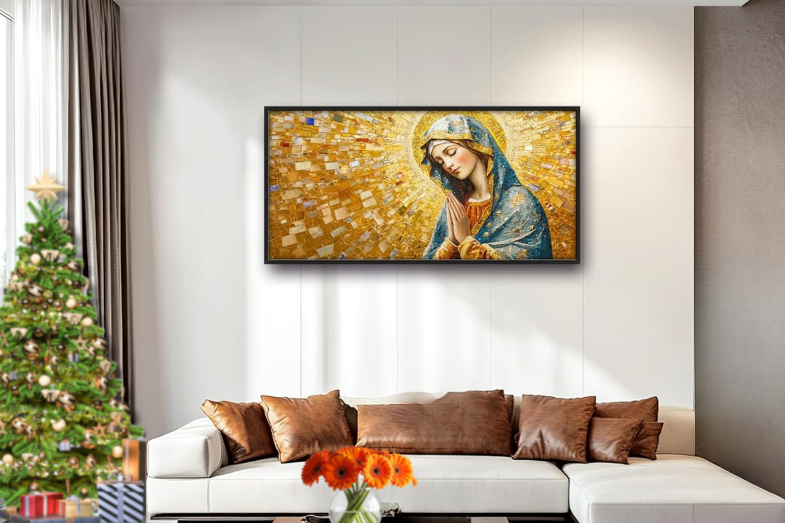 Bring warmth, grace, and spiritual beauty into your home with this stunning Virgin Mary canvas by Luxvio. Designed in an oversized 60 x 30 inch format, this artwork commands attention while maintaining a peaceful, calming presence.