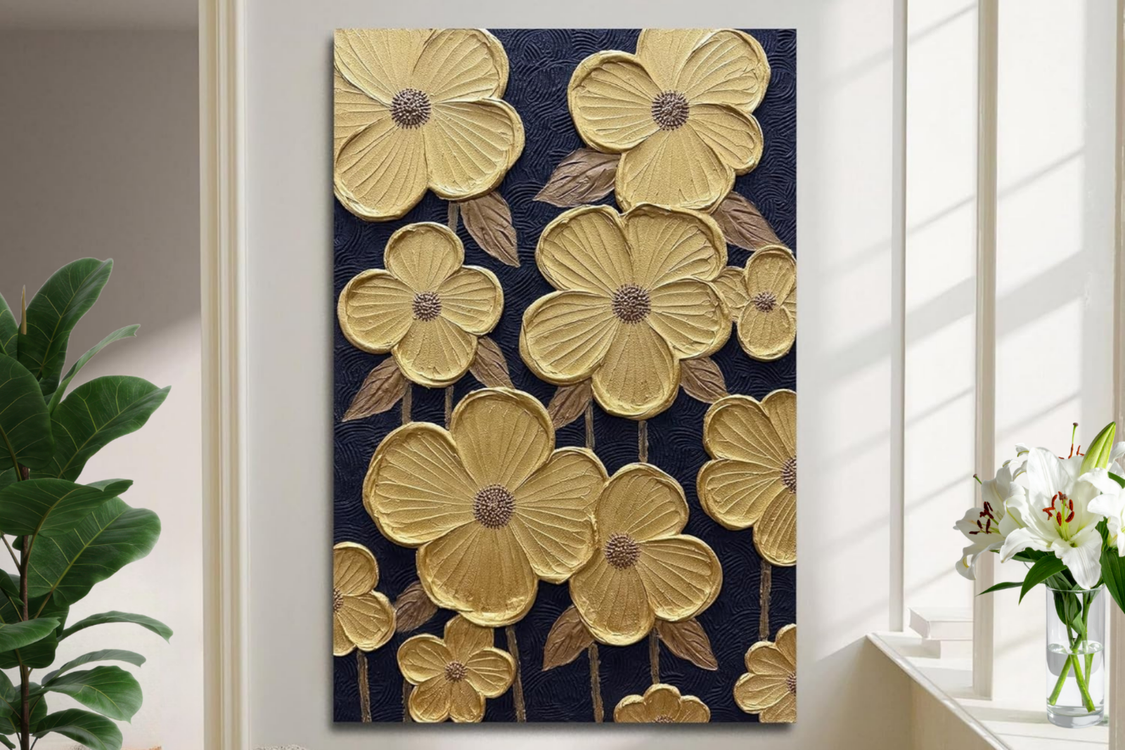 This moshinart 24 x 36 inch hand-painted oil painting brings understated luxury to modern interiors. Featuring raised gold petal floral motifs set against a rich, dark textured background, this artwork blends minimalist design with tactile depth. The sculptural petals catch the light beautifully, creating a subtle 3D effect that elevates the space without overwhelming it. Perfect for living rooms, bedrooms, or home offices, this elegant canvas adds warmth, sophistication, and a refined artistic presence to contemporary décor.