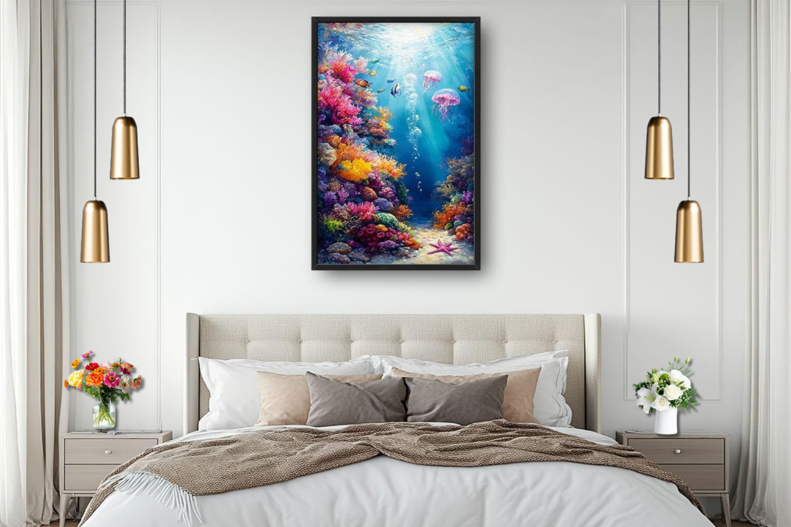 This stunning ocean wall art brings the tranquil beauty of the underwater world into your home. Featuring vibrant coral reefs, graceful jellyfish, colorful tropical fish, and soft rays of light filtering through crystal-blue waters, this framed seascape creates a calm yet visually captivating focal point.