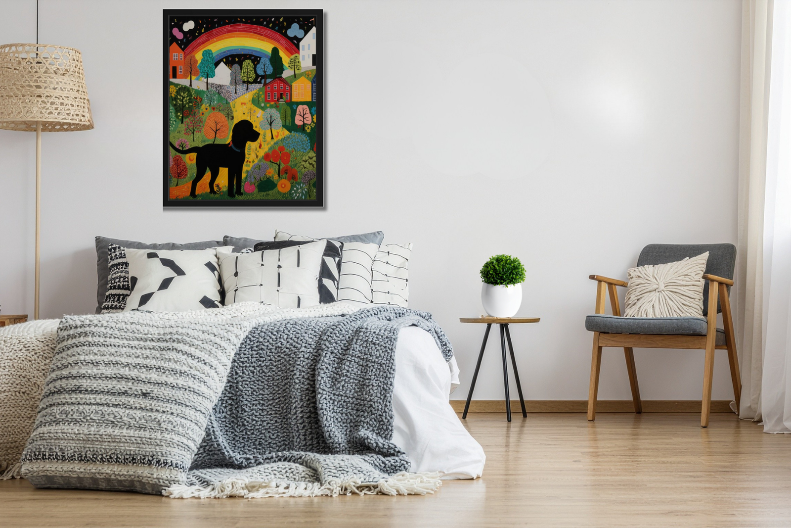 Surrounded by colorful trees, blooming flowers, and cozy village homes, this folk art print brings warmth, optimism, and personality to any space. Its cheerful palette and illustrative style make it a lovely accent for pet lovers, creative homes, children’s rooms, or anyone drawn to expressive, feel-good wall decor.