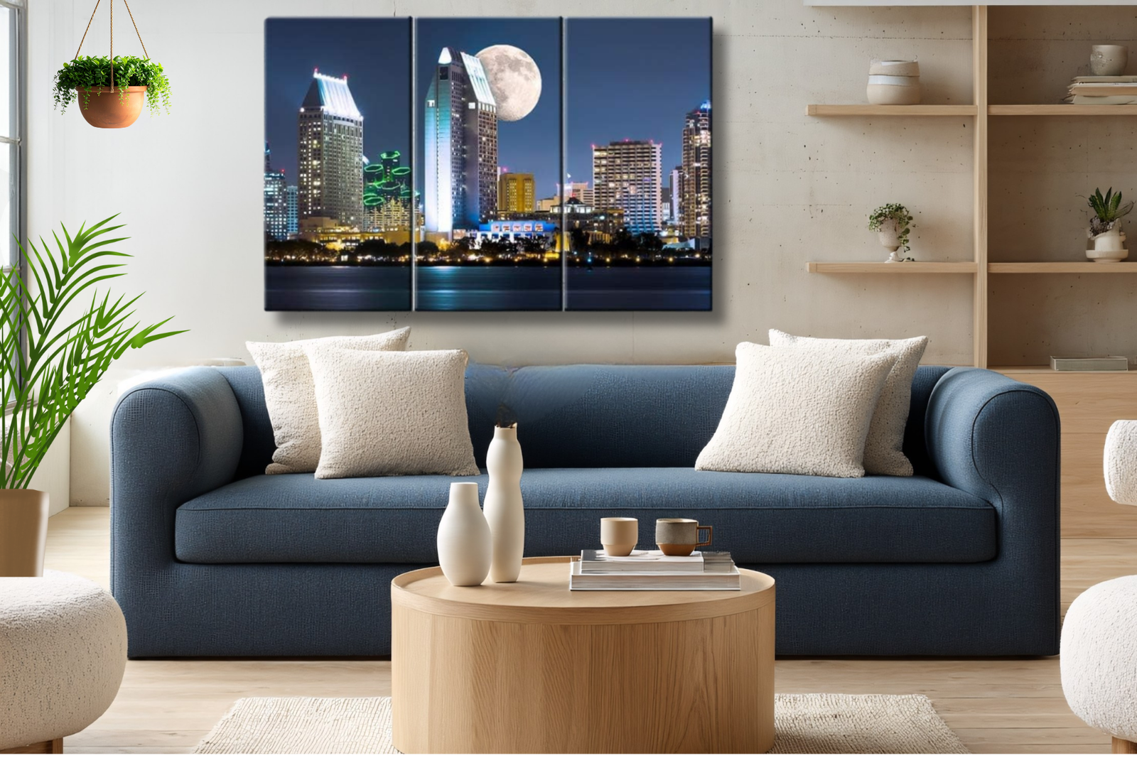 Bring the serene glow of the city into your space with this stunning San Diego downtown skyline canvas wall art. Captured at night under a luminous full moon, this elegant cityscape blends modern architecture with tranquil coastal reflections, creating a calming yet sophisticated focal point for any room.
