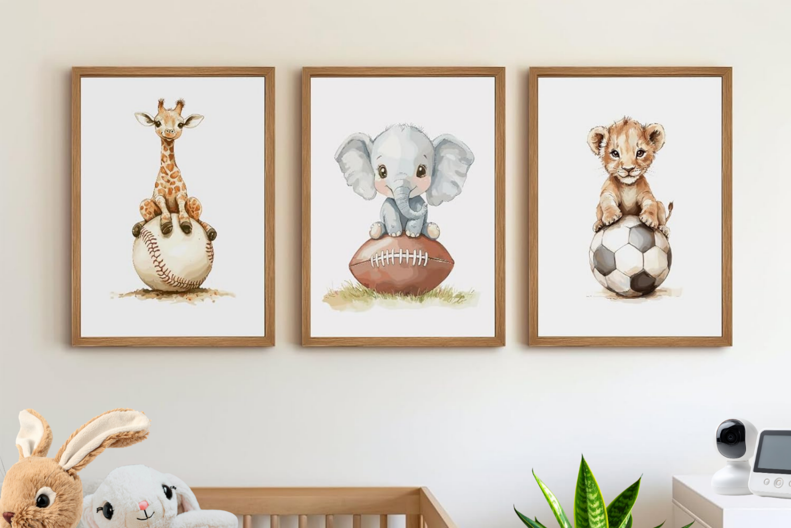 Add a playful and sporty touch to your little one’s space with this adorable sports-themed nursery wall art. Featuring charming safari baby animals playfully perched on football, soccer, and baseball designs, this canvas wall art brings fun, warmth, and personality to a baby boy’s nursery or kids’ bedroom. Soft colors and whimsical illustrations make it perfect for jungle or safari-themed rooms while introducing a lighthearted sports vibe that parents will love.