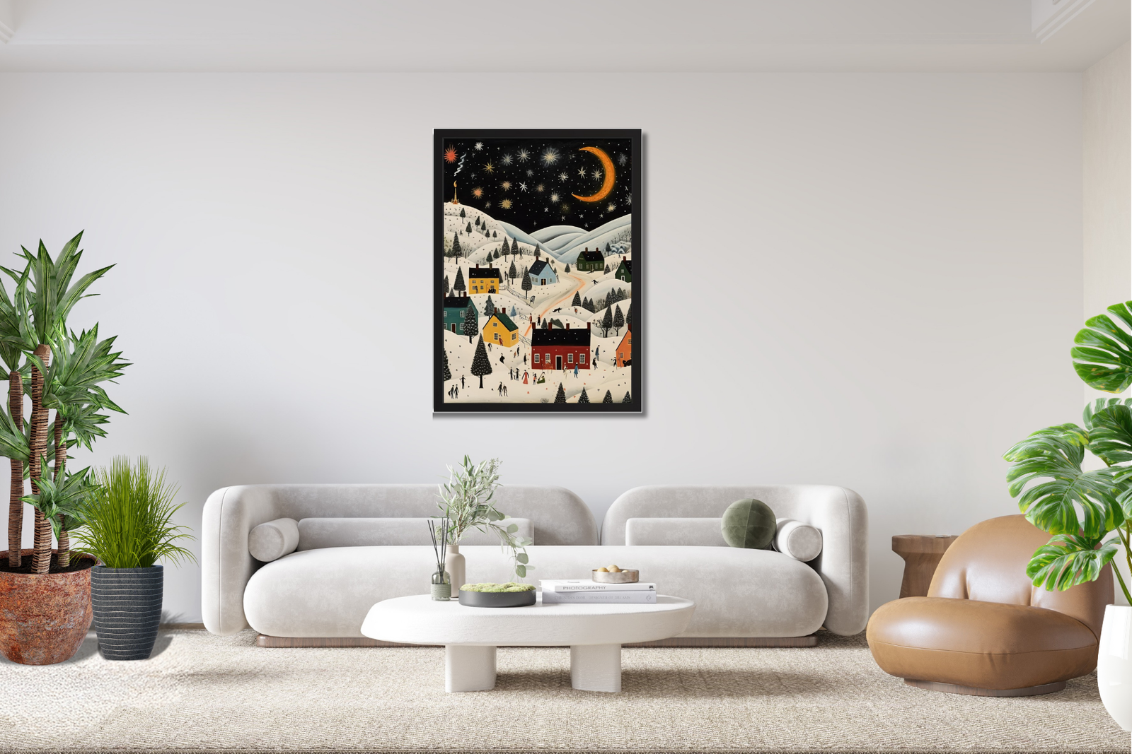 Rendered in a classic American folk art, naïve painting style, the artwork balances cozy warmth with whimsical charm. The contrast between deep night skies and soft snowy landscapes creates a sense of wonder, nostalgia, and calm. Perfect for living rooms, bedrooms, or any space that could use a touch of storybook enchantment, this piece pairs beautifully with farmhouse, cottagecore, rustic, and traditional interiors.