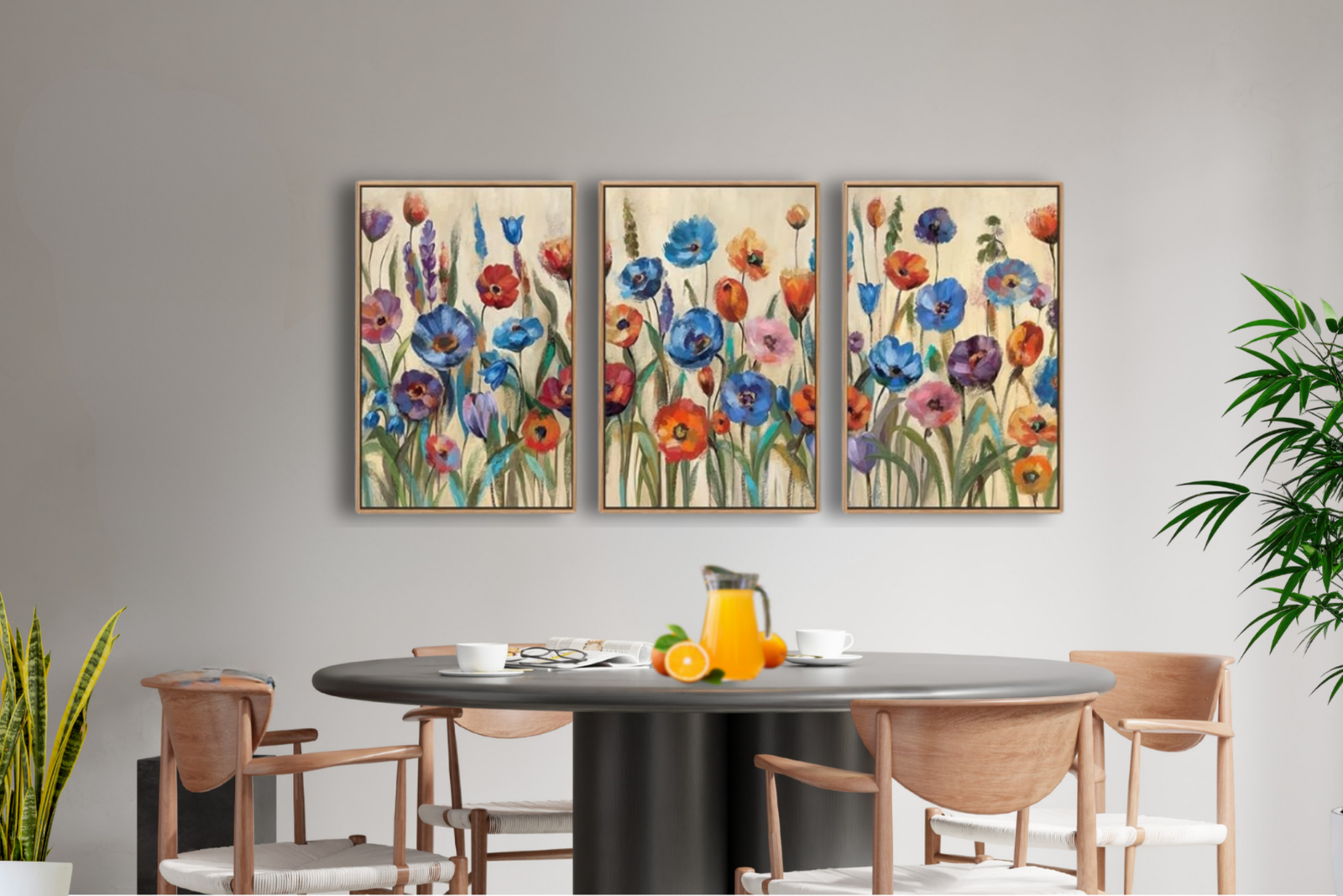 This vibrant floral wall art set features expressive blue and red poppies painted in a loose, painterly style that brings warmth and life to any space. Set against a soft neutral background and finished with a natural wood frame, the wildflower artwork adds a fresh botanical touch without overwhelming the room. Perfect for living rooms, bedrooms, dining areas, or cozy reading corners, this 3-panel canvas creates a balanced, uplifting focal point that blends beautifully with modern, boho, or farmhouse décor.