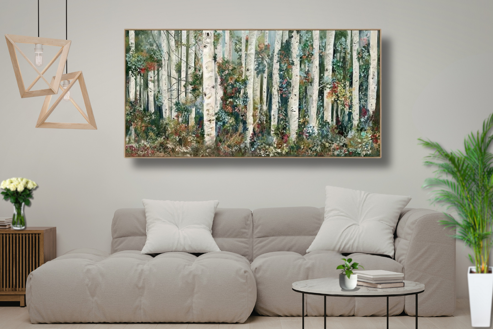 This birch forest canvas wall art from the tigeridge Store brings the quiet beauty of nature indoors. Featuring slender white birch trees surrounded by soft greenery and gentle floral accents, the artwork creates a peaceful woodland scene that feels both refreshing and grounding.