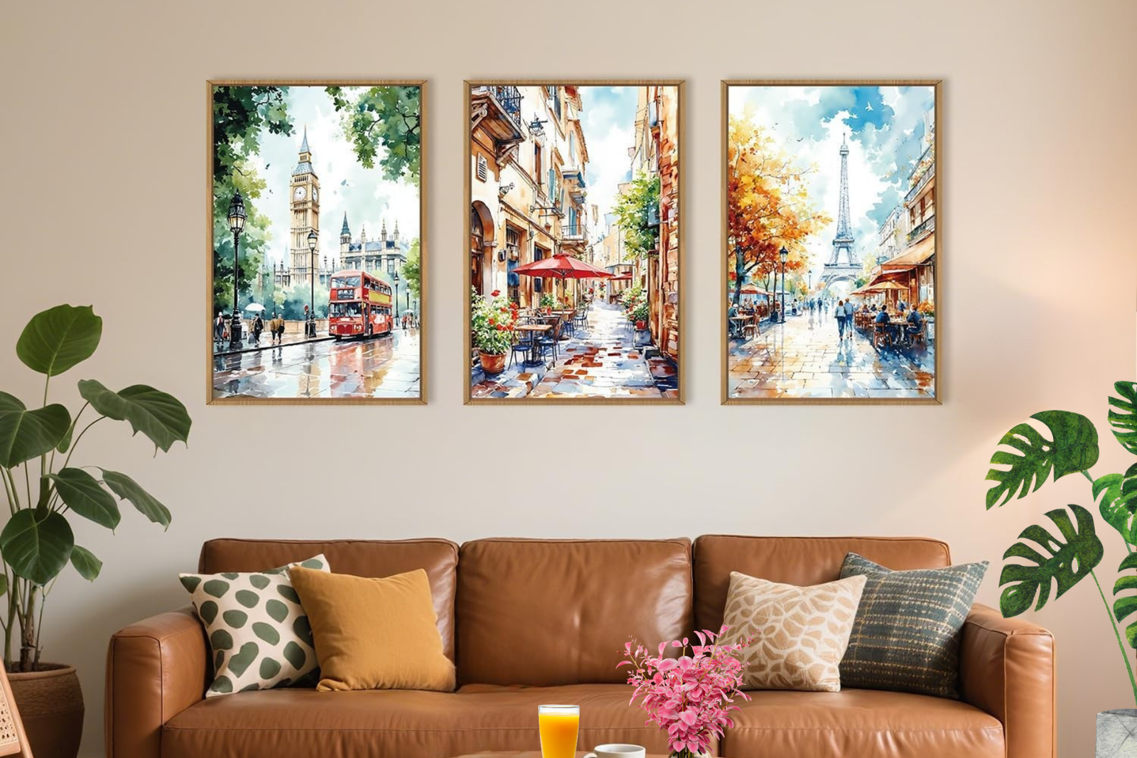 Bring the romance of Europe into your home with this beautifully coordinated watercolor canvas set featuring three iconic street scenes. From the timeless elegance of London’s Big Ben and red double-decker buses, to a charming café-lined European alley, and the golden glow of Paris near the Eiffel Tower, this artwork captures the magic of travel in a soft, painterly style.