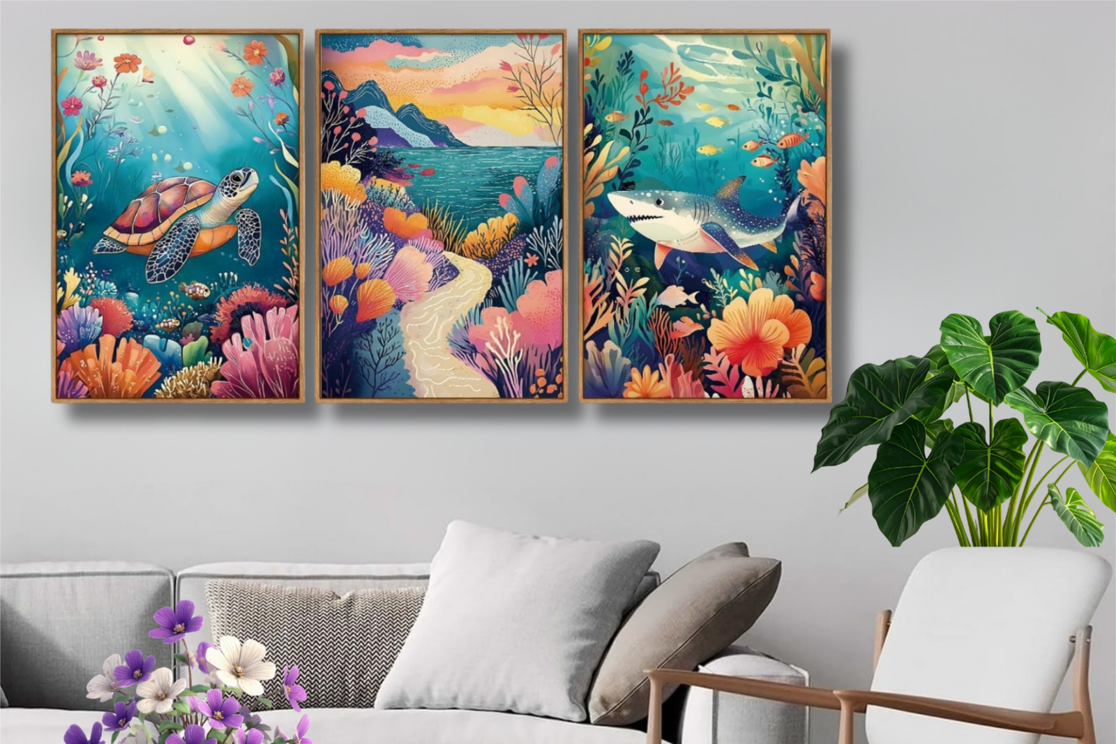 Bring the magic of the ocean into your home with this vibrant YeeHomedec Watercolor Marine Life Canvas Wall Art Set. Featuring three beautifully framed panels, this coastal-inspired artwork showcases a serene sea turtle, a dreamy ocean landscape, and a graceful shark swimming among colorful coral reefs.