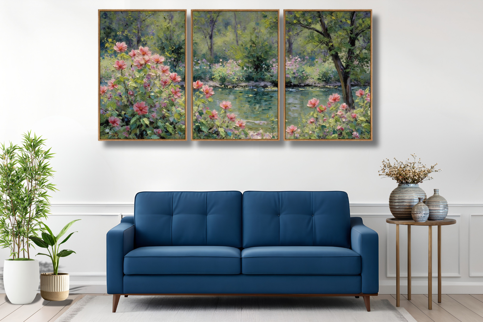 Create a serene, gallery-style statement with this Yeehomedec Monet-inspired framed canvas wall art set, featuring a peaceful impressionist garden scene filled with blooming flowers, tranquil water, and softly shaded trees. Inspired by classic European impressionism, the artwork showcases loose brushstrokes, layered textures, and a harmonious palette of greens, pinks, and soft blues.