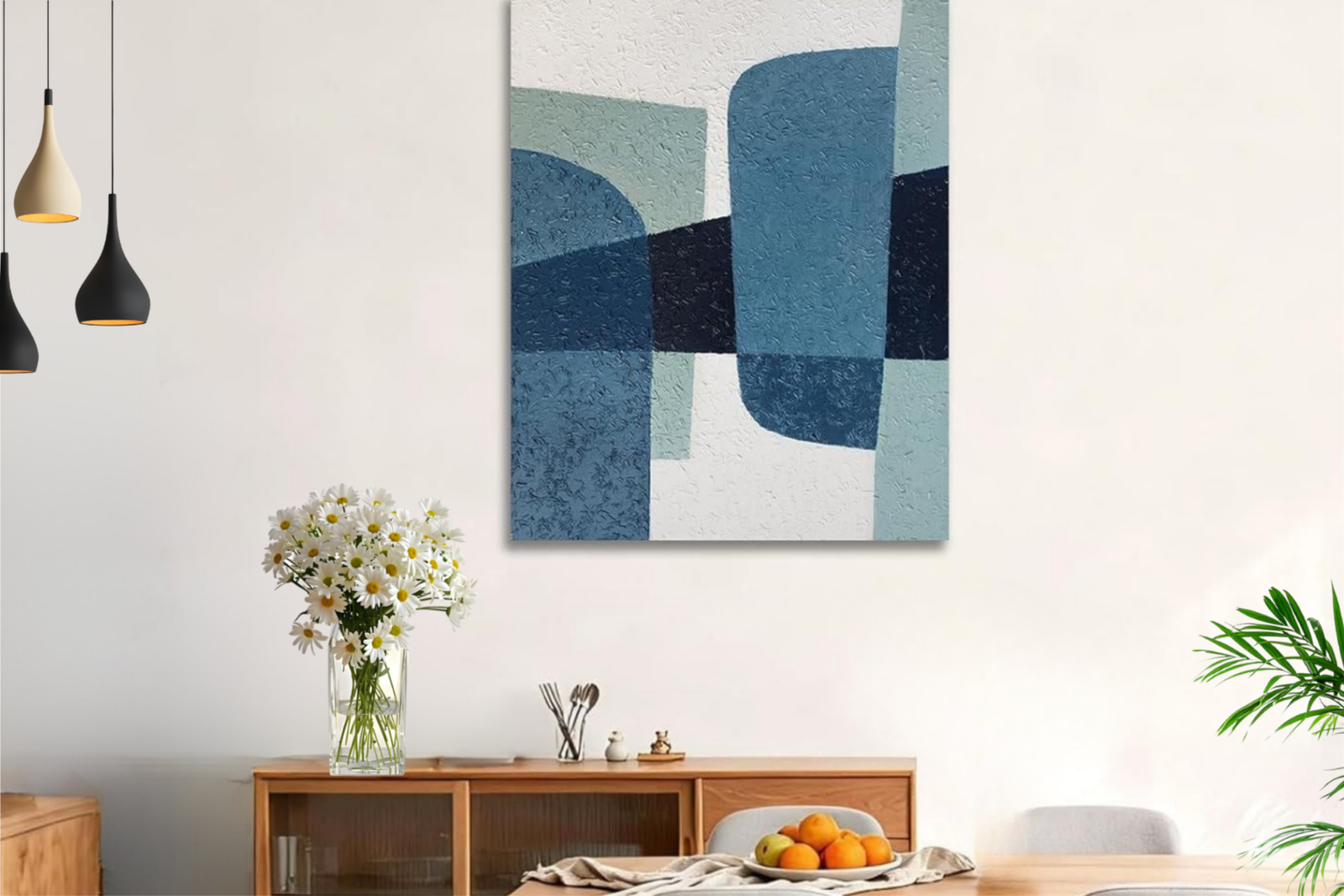 Create a calm, sophisticated focal point with this ZHENGYIN blue and gray abstract wall art, inspired by mid-century modern design. Featuring clean geometric forms, softly curved shapes, and a harmonious palette of blue, gray, and muted neutrals, this minimalist artwork brings balance and understated elegance to any space.